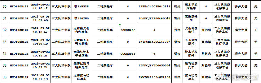 1、以下车辆在2024年09月01日至2024年09月30日期间因涉及道路交通违法,已被公安交通管理部门依法扣留,其驾驶人、所有人和管理人均未按规定期限到公安交通管理部门接受处理。根据《中华人民共和国道路交通安全法》第一百一十二条、《中华人民共和国道路交通安全法实施条例》第一百零七条等相关法律法规的规定,现予以公告。自本公告发布之日起经过三个月,当事人仍不前来接受处理的,公安交通管理部门将对扣留的车辆依法处理。