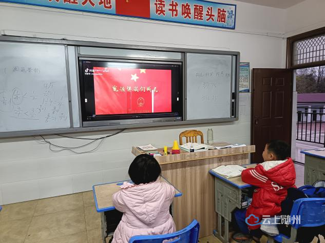 开展宪法诵读活动,学生在老师的带领下齐声诵读宪法部分章节、条款。