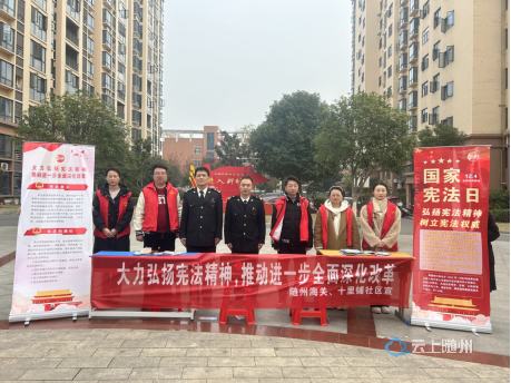 为大力弘扬宪法精神,增强社区居民的法律意识,促进社区平安和谐,12月3日,十里铺社区联合随州海关在卢家坡花园小区开展“大力弘扬宪法精神,推动进一步全面深化改革”国家宪法日宣传活动。