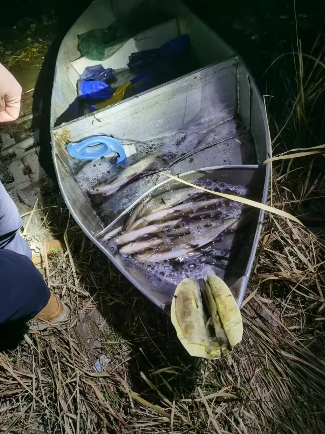 近日,有群众多次反映,白云湖河畔有人电打鱼。曾都区公安分局森林警察大队经过多次巡查和摸排线索,确定了电打鱼的重点区域。于2024年12月24日晚至25日凌晨3点,在白云湖红山头河段蹲守,抓获2名非法捕捞的违法行为人。经查,12月24日晚11时许,违法行为人王某和妻子带着渔船、网具、电瓶等工具,到白云湖红山头河段下网捕鱼,直至被查获。目前,此案正移交给渔政部门作进一步处理。