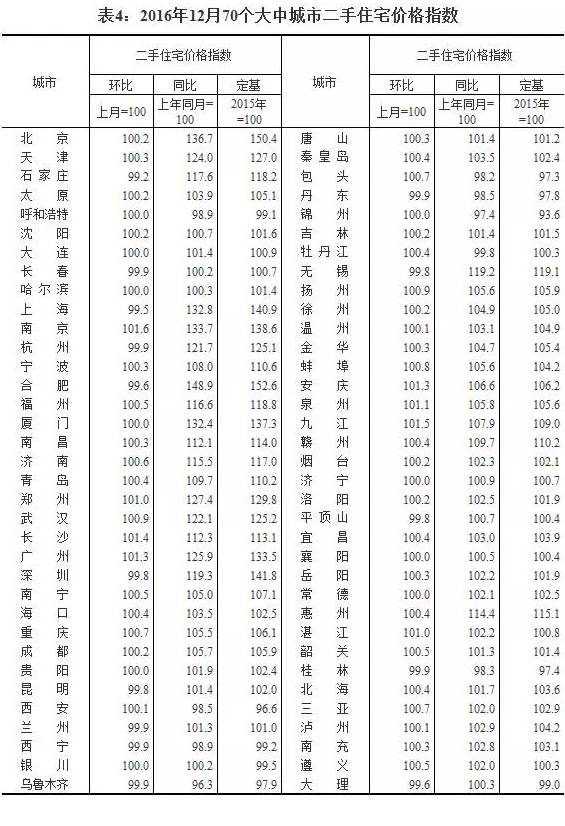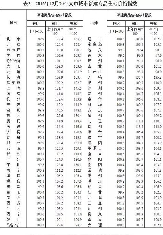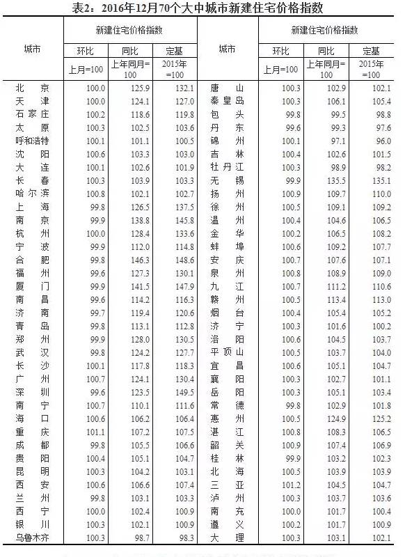18日,国家统计局发布了2016年12月70个大中城市住宅销售价格统计数据,以及15个一线和热点二线城市新建商品住宅价格变动对比表。数据显示,70个大中城市中,有46个城市新建商品住宅价格环比上月上涨,4个城市持平,20个城市环比下降。同比去年12月份来看,65个城市新建商品住宅价格同比上涨,5个城市同比下降。