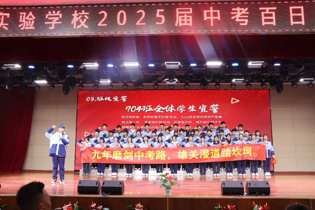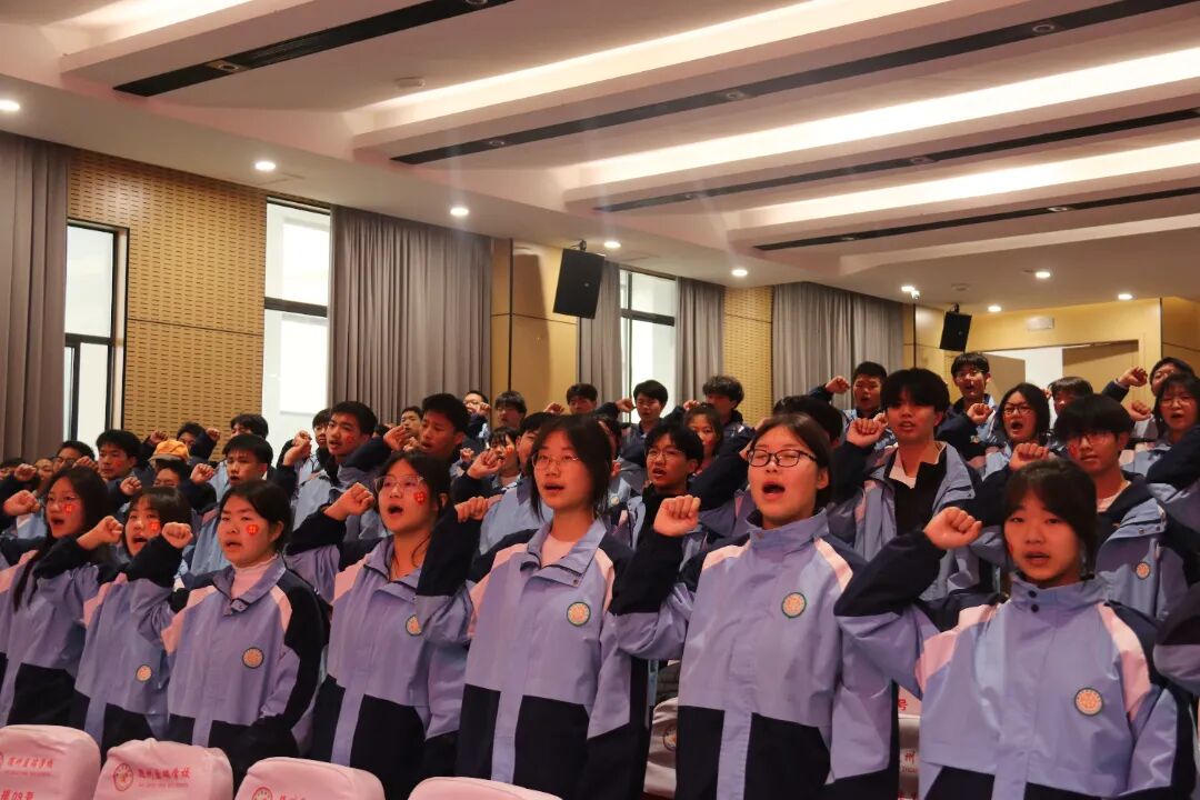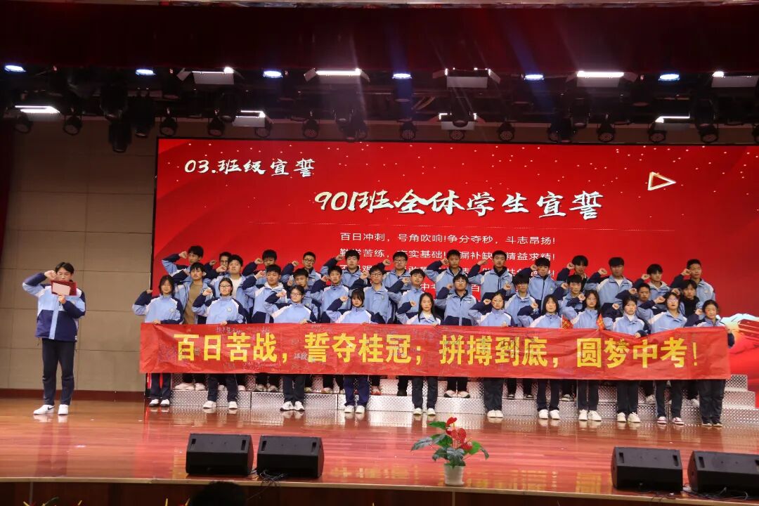 每位同学都豪情满怀,志气昂扬。声声誓言激荡校园,震天撼地,响彻苍穹。铿锵有力的誓词,瞬间点燃全场,奏响备战中考,拼搏百日的集结号!