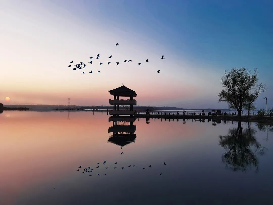 月光海湖心亭,夕阳映水,群鸟翱翔。(李端 摄)