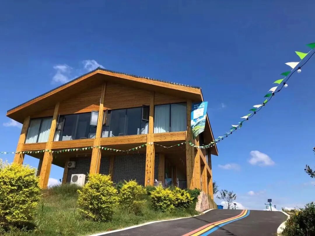 蓝天白云下,月光茶园小木屋彩旗飘扬。