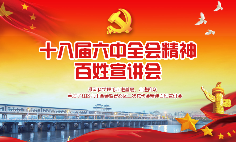 为深入贯彻党的十八届六中全会精神、习近平总书记系列重要讲话精神和区二次党代会精神,把党的创新理论、方针政策、重大决策部署,通过百姓的视角、百姓的语言、百姓的方式宣传到基层中去,深入推进社会主义核心价值观教育,不断推动科学理论走进基层、走进群众,西城办事处草店子社区将于2017年1月20日(周五)下午2:30举办党的十八届六中全会精神百姓宣讲会。