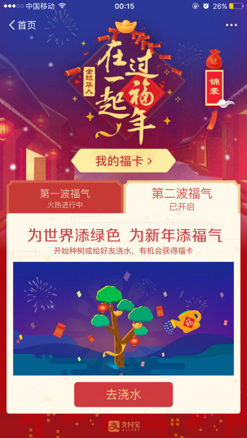 1.第二波集福活动就是蚂蚁森林浇水或者种树哦,有机会获得福卡哦!让我们和支付宝一起来让这个地球妈妈变得更绿吧!