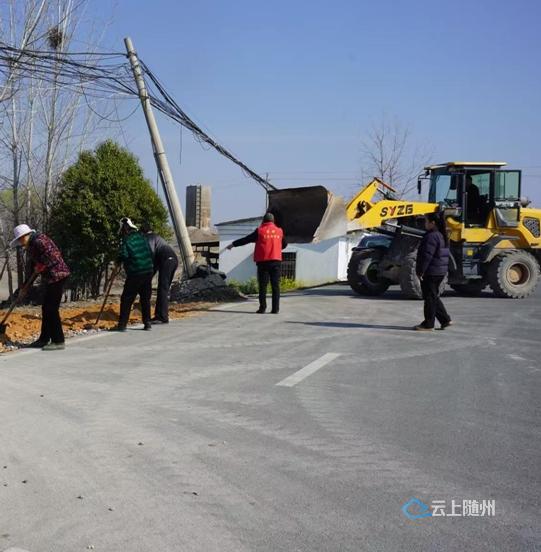 2025年3月31日下午,曾都经济开发区太山庙村太山路旁,通信施工人员正在对完成加固的线杆进行最后检查。