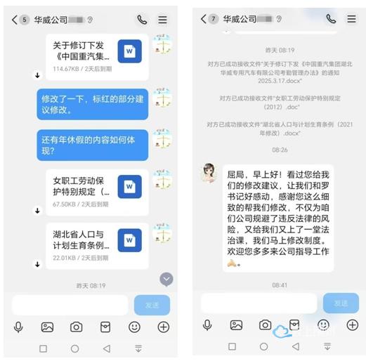 “屈院长,看过您给我们的修改建议,感谢您这么细致地帮我们修改,不仅为公司规避了违反法律风险,又给我们上了一堂法治课,我们马上继续修改完善制度,欢迎您多来公司指导工作。”近日,区劳动人事争议仲裁院院长屈真江收到来自该区湖北重汽华威公司人资部的短信,短信中,该公司对区仲裁院提供的人资管理建议表示了衷心的感谢。