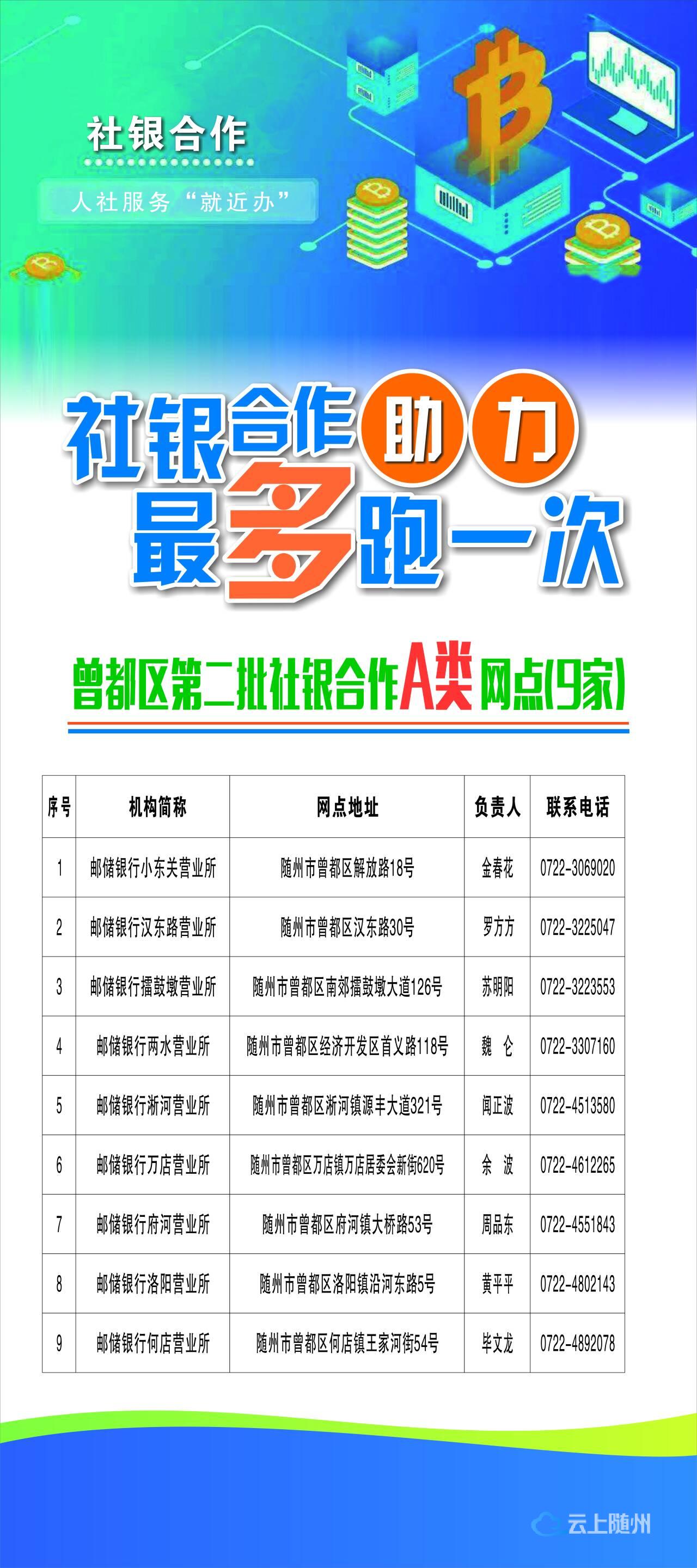5月27日,中国邮政集团随州市曾都分公司营业厅内,洋溢着便民服务的暖意。随着红色帷幕的揭开,曾都区人社局与曾都邮政共建的9个社银合作网点正式启用,标志着全区实现主要乡镇社银服务网络全覆盖,群众在家门口就可办理19类48项高频社保业务。