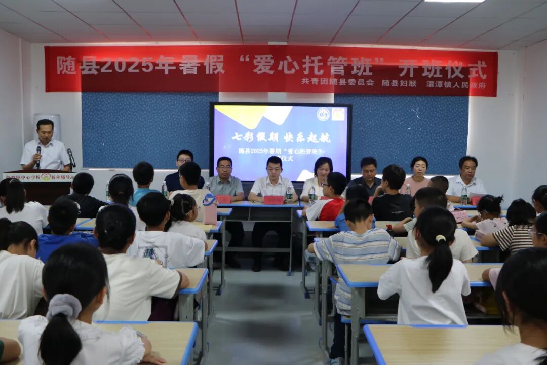 7月3日,随着蝉鸣声声,随县2025年暑假“爱心托管班”在澴潭镇中心学校校外辅导站正式拉开帷幕。团县委、县妇联、县教育局和澴潭镇党委政府相关负责人齐聚现场,共同见证这一温暖时刻。