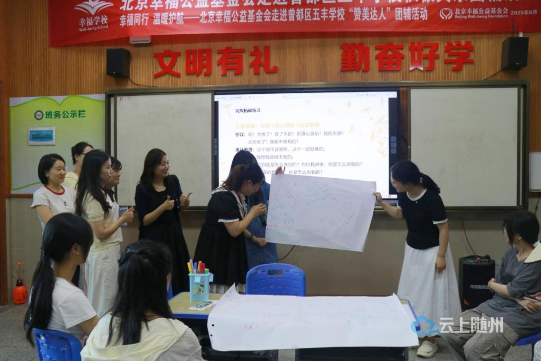 2025年8月28日,曾都区五丰学校举办积极教育心理培训活动。作为幸福学校体系的重要实践,本次活动特邀积极情绪专家、北京幸福公益基金会公益讲师王阿芹老师及其团队,为全校教师带来“积极关系团辅”专题培训,旨在通过科学方法赋能师生心理健康。