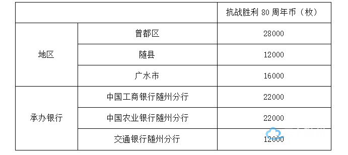 根据中国人民银行纪念币发行工作安排,中国人民抗日战争暨世界反法西斯战争胜利80周年普通纪念币(以下简称抗战胜利80周年币)在随州市的预约发行工作由中国工商银行、中国农业银行、交通银行随州分行(以下统称承办银行)共同承担。抗战胜利80周年币随州市分配数量为5.6万枚,每枚面额为10元,每人预约、兑换限额为20枚。