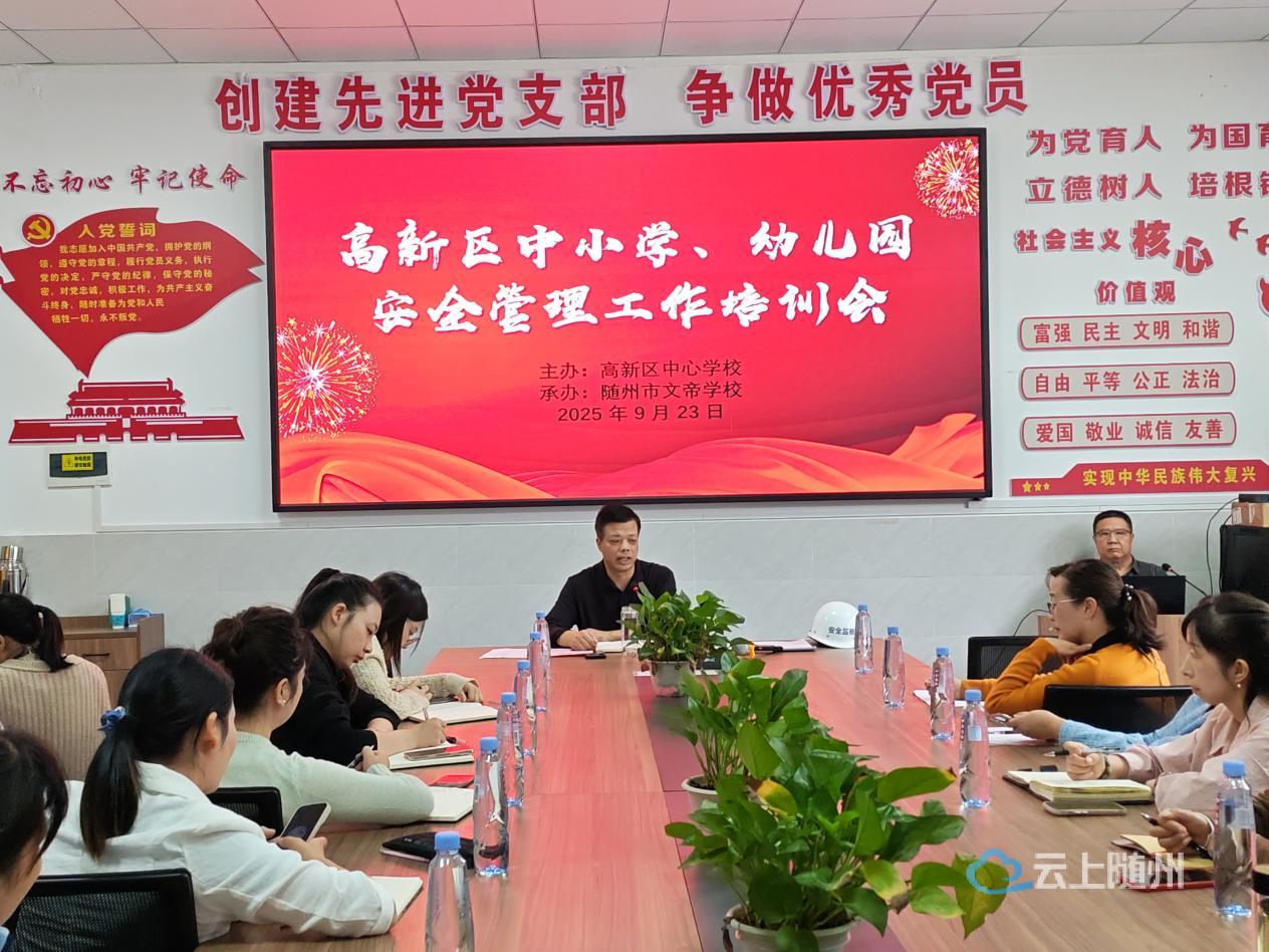 9 月 23 日上午 ,正值新学期开学初期校园安全事故 “高发期”,由随州高新区中心学校主办、随州市文帝学校承办的高新区中小学及幼儿园安全管理工作培训会,在文帝学校如期举行。本次会议由高新区中心学校王扬旭校长主持,随州高新区城东工作局安全生产专家顾问聂绍雄作专题发言,高新区各学校分管安全副校长、主任及各幼儿园园长、安全主任全员参会。
