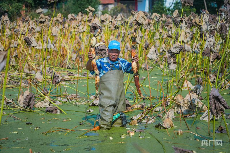 在“龙门镖局”供应链公司的产地仓内,工人们正熟练地对刚采收的莲藕进行分级、包装。公司总经理曹磊介绍,这里每天处理莲藕8万至10万单,通过线上线下渠道销往全国,日销售额约二十万元。