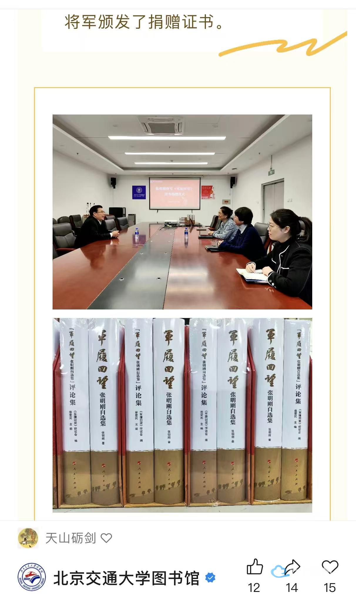 张明刚将军的捐赠行为蕴含着对青年成长的深远考量。在新型多元化信息获取冲击传统阅读方式的当下,其将著作定位为“增强人民精神力量的优秀作品”,体现了对文化根基的坚守。高校图书馆作为知识传播中枢和文化前沿阵地,通过收藏此类著作,实际上是在构建抵御价值虚无的文化堡垒,对抢占新时代社会主义文化阵地制高点具有重要意义。