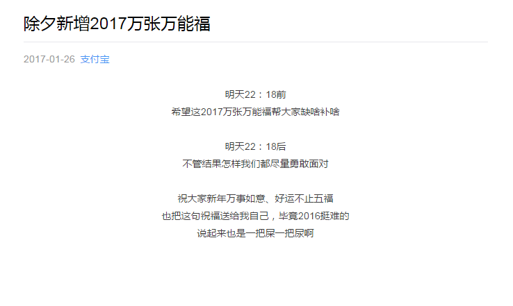 据支付宝微信公众号消息,支付宝宣布将在今天22:18前送出2017万张万能福,帮助更多的网友满足心愿。
