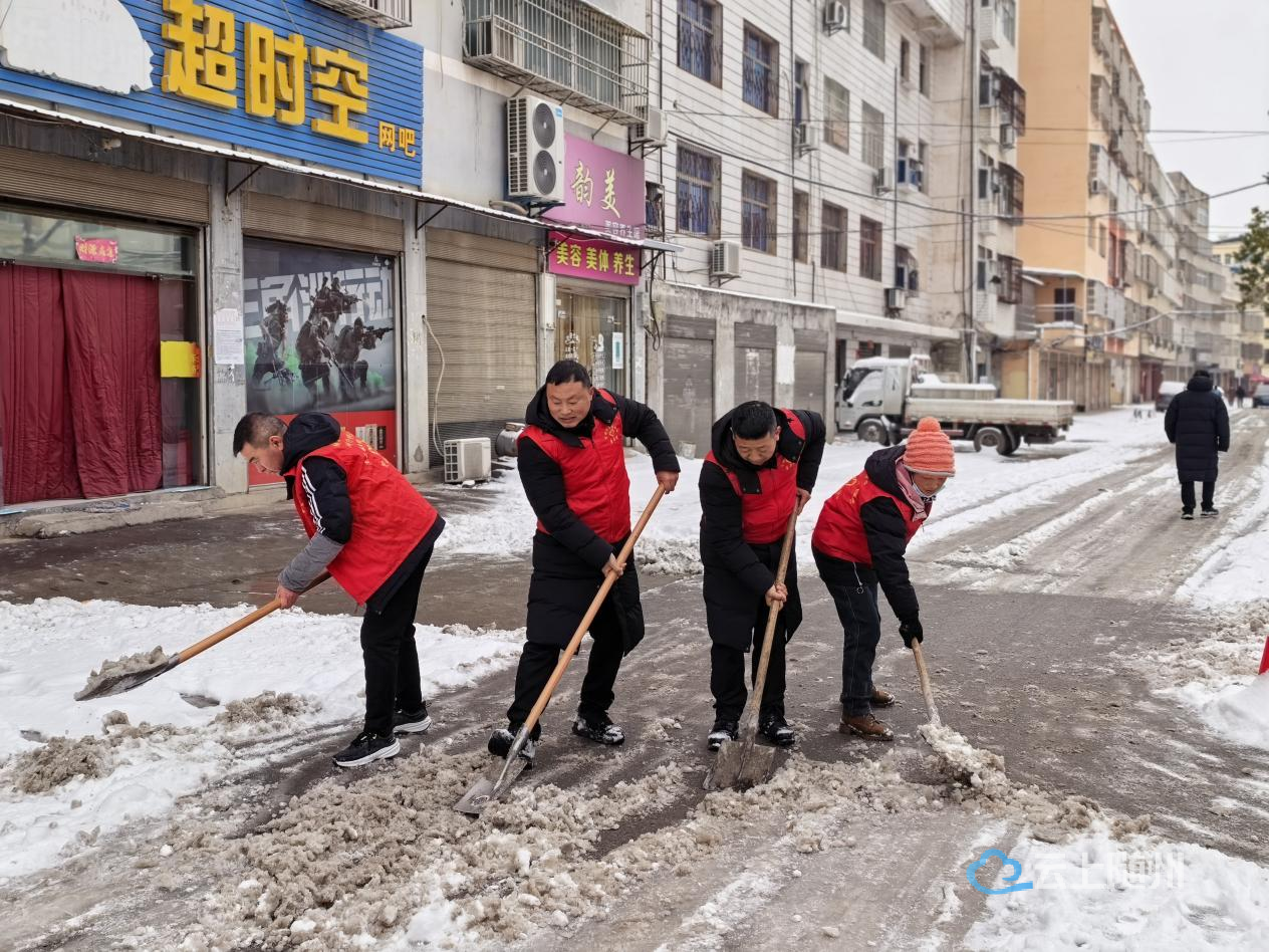 志愿服务队队员分工有序,有人铲除厚雪,有人清扫残冰,有人铺设地毯。经过两个多小时的持续劳动,党群服务中心周边区域及连接主路的通道变得整洁畅通,安全无虞。