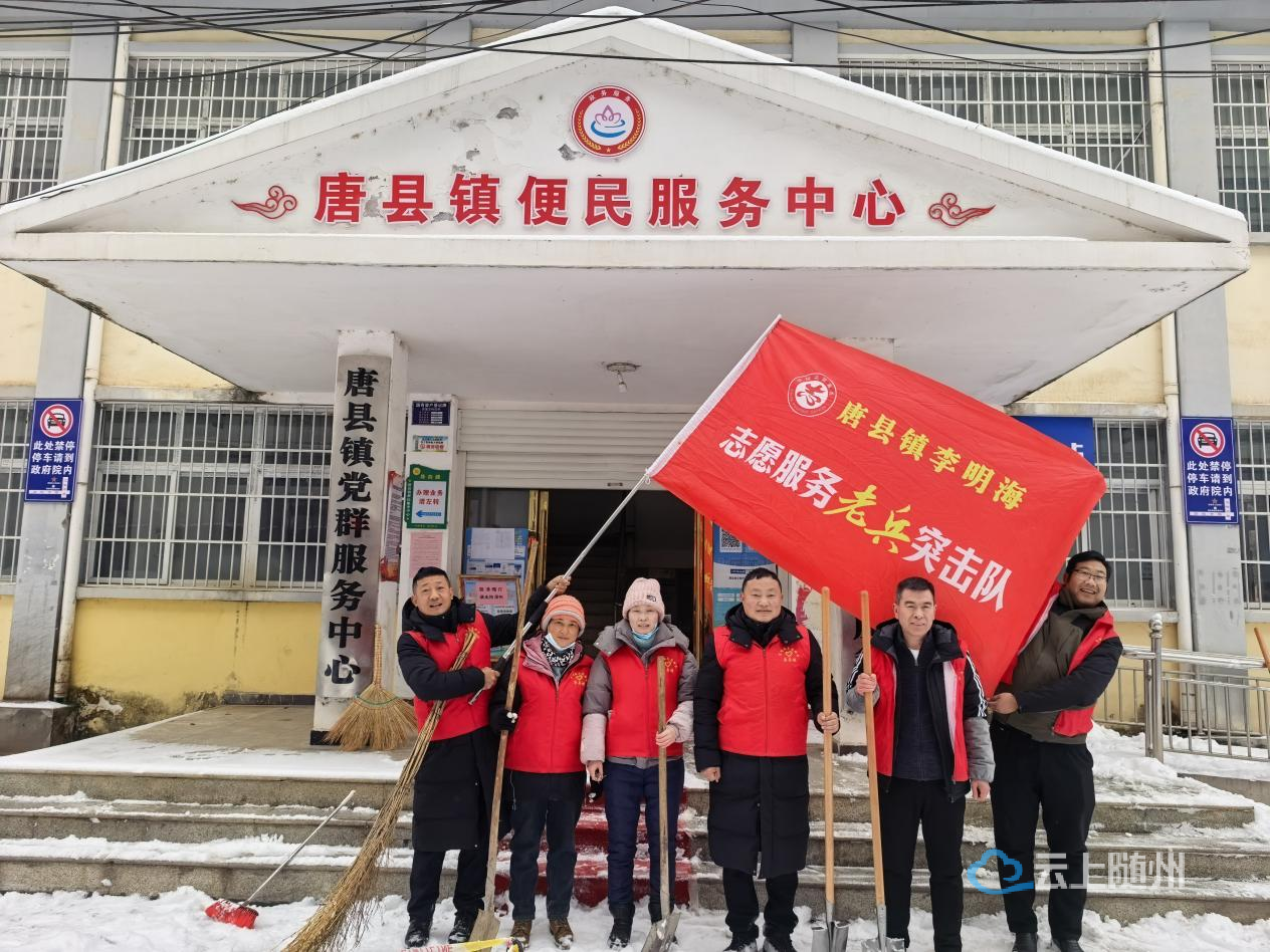 2026年1月20日上午,随县唐县镇党群服务中心门前一片繁忙景象。在中心主任魏晓伟的带领下,唐县镇张富清老兵志愿服务队十余名队员顶着严寒,清扫积雪、铺设红毯、设置安全警示,为群众开辟出一条安全又暖心的出行通道。