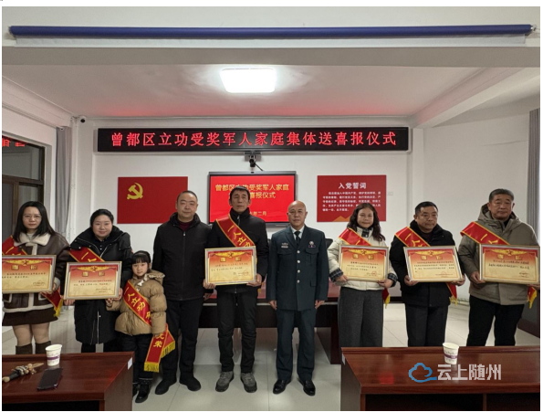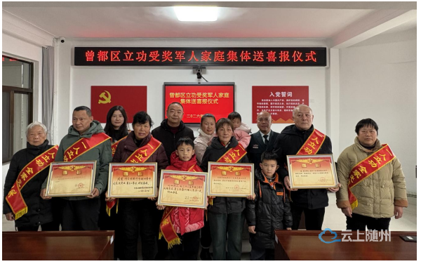新春佳节来临之际,为弘扬拥军优属光荣传统,营造“一人立功、全家光荣”的浓厚社会氛围,助力曾都优化营商环境,曾都区退役军人事务局近期组织开展了喜报送上门、集中送喜报等多种形式的送喜报活动,将党和政府的关怀与褒奖送到军人军属心坎上。