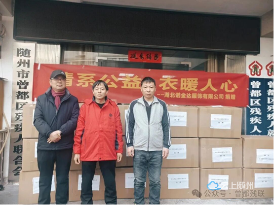 2026年1月26日下午,湖北诺金达服饰有限公司向曾都区残联捐赠市场价值9万余元的崭新服装,其中秋装117套、棉服211件。湖北诺金达服饰有限公司是随州本土的一家集设计、研发、生产、销售于一体的综合性服装企业。该公司承接全国300多所学校校服设计和生产,也是武汉大学、长江大学、厦门大学等知名大学的校服供应厂家。