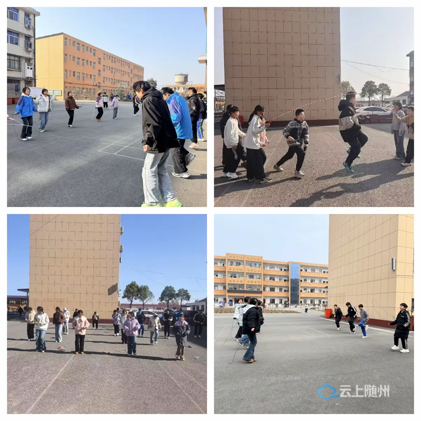 跳绳是擂鼓墩初级中学近两年开展的大课间活动。在学校领导的高度重视下,经过体育老师的精心辅导,该活动不仅强健了孩子们的体魄,而且以练促赛,屡屡在不同场合展示了学校艺体特色形象。2025年全校学生表演绳舞获得了全市中小学校活力大课间展演一等奖。组团参加湖北省体育特色项目学校跳绳比赛,获得“3分钟十人八字项目”冠军、初中男子30秒单摇第四名……