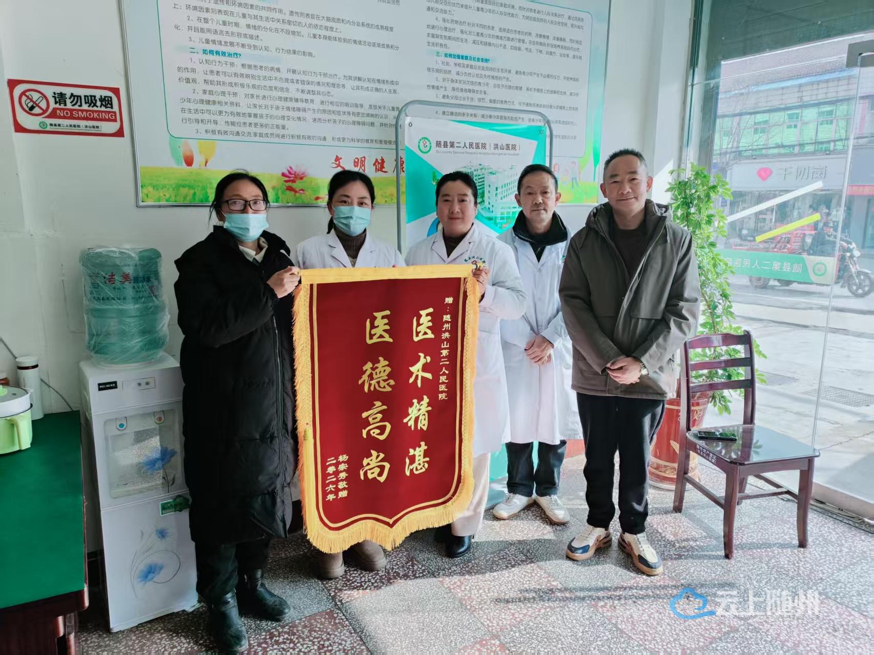 一面锦旗,承载着群众对医疗服务的认可;一句感谢,凝聚着医患同心的温情。精神卫生关乎群众身心健康、家庭幸福与社会和谐,是重要民生课题。近日,随县第二人民医院精神心理科诊室内暖意涌动,患者杨女士的家属将印着“医术精湛 医德高尚”的鲜红锦旗,郑重送到科室主任及全体医护手中,真挚的谢意,定格下医院守护群众精神健康的动人瞬间。