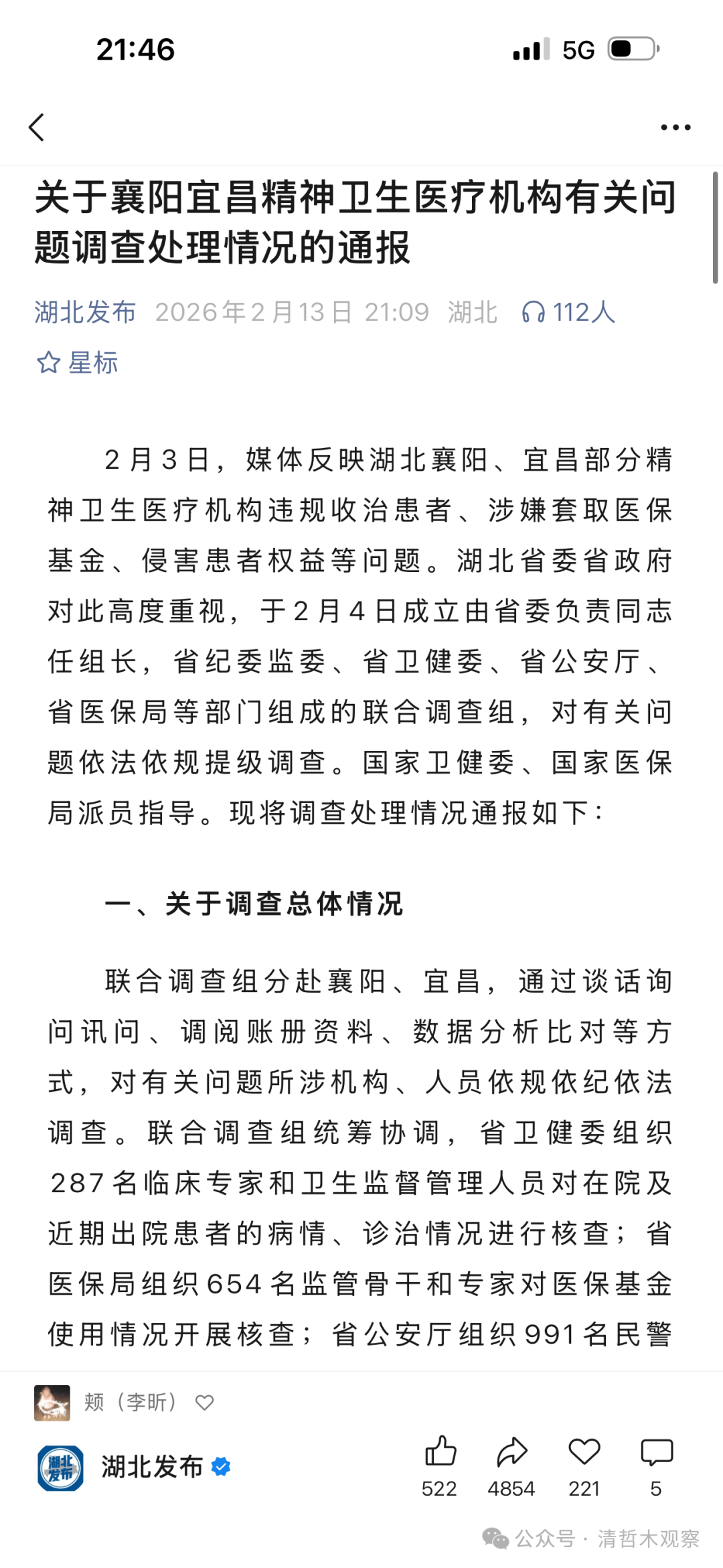 从2月3日媒体曝光,2月4日省级联合调查组火速成立,2月13日详尽通报公之于众。湖北襄阳、宜昌部分精神卫生医疗机构骗保事件,在短短十天内经历了从舆情发酵到雷霆整治的全过程。此次事件的处理,充分彰显了湖北省委省政府直面问题、绝不护短的坚决态度,以及将舆论监督作为改进工作重要抓手的治理智慧。