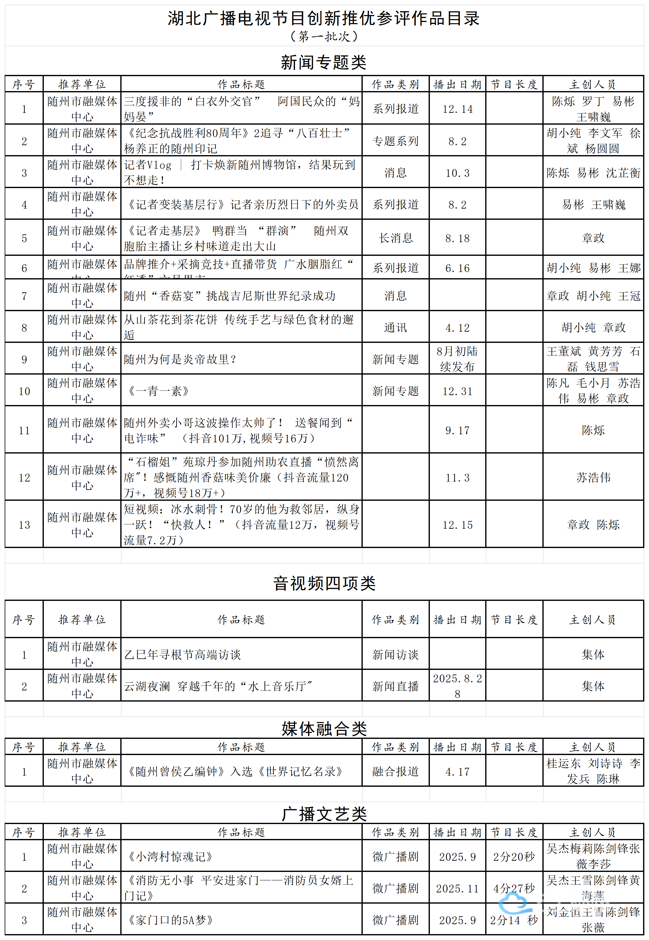 根据《2025年度湖北广播电视节目创新推优评选办法》,现对本单位推荐参评新闻作品(第一批次)予以公示(其中,音视频四项类作品同时报送2025年度湖北优秀新闻作品),公示时间2月27日——3月3日,公示期间,若对公示内容有异议,可通过电话方式反映。反映情况要实事求是,客观、公正、具体。