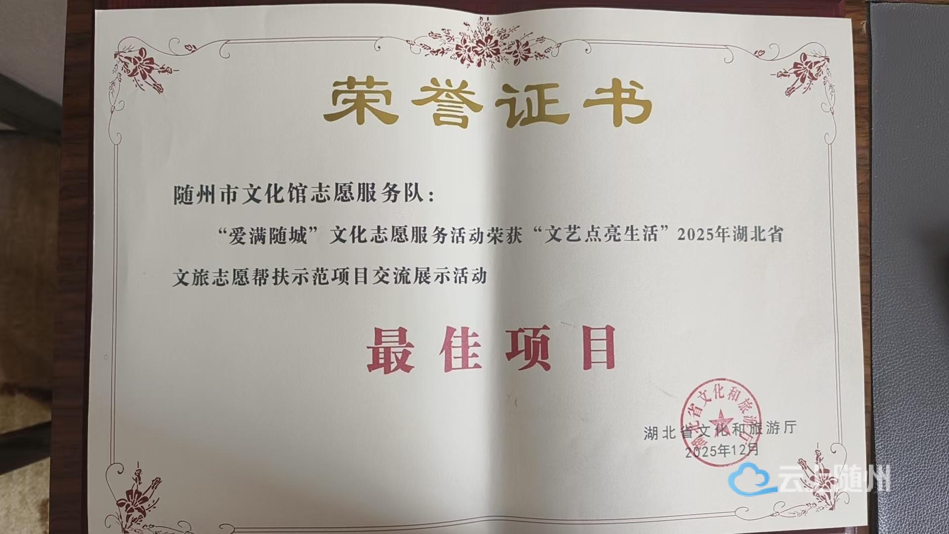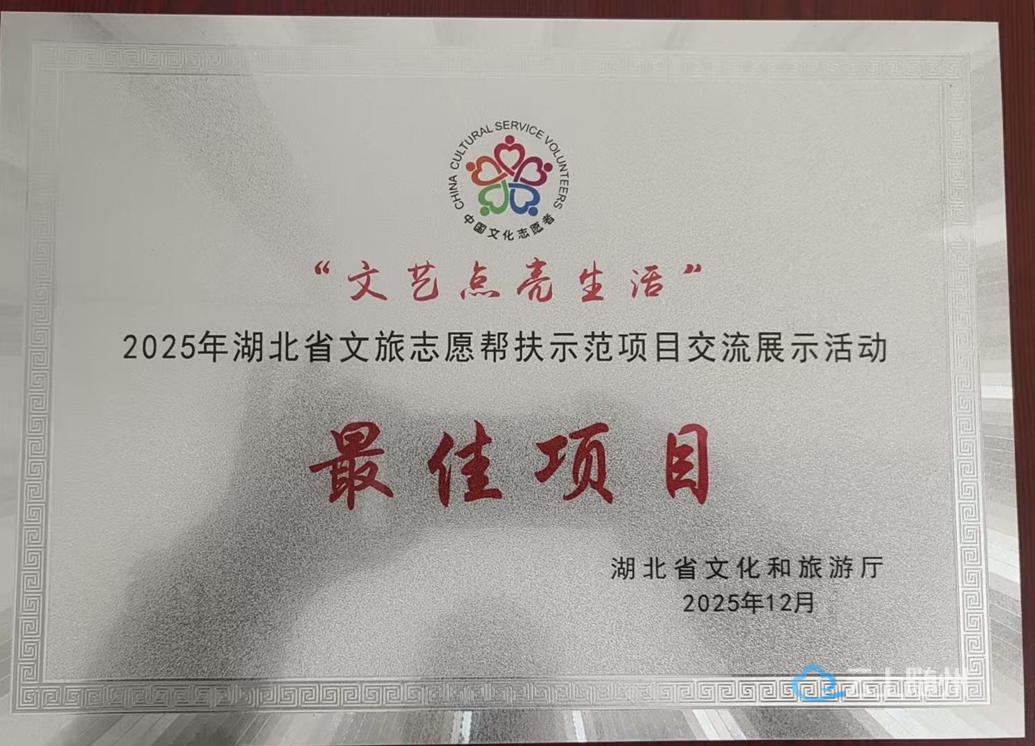 近日,由湖北省文化和旅游厅主办的2025年湖北省文旅志愿帮扶示范项目交流展示活动圆满落幕。随州市文化馆志愿服务队选送的“爱满随城”文化志愿服务活动,凭借扎实的服务成效与鲜明的地域特色,从众多项目中脱颖而出,荣获“文艺点亮生活”2025年湖北省文旅志愿帮扶示范项目交流展示活动最佳项目称号。