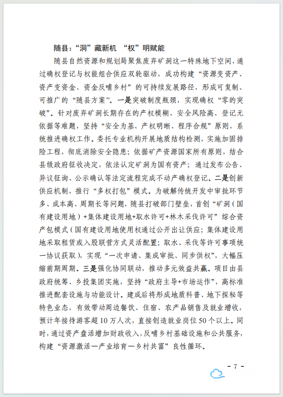 随县积极探索自然资源确权登记与特色产业融合发展新路径。针对县域内大量闲置洞穴资源,该县创新开展洞穴使用权确权登记试点,明确权属、盘活资产,引导村集体和企业发展食用菌种植、冷链仓储等“洞藏经济”,让沉睡资源变身“致富宝库”。通过“确权赋能+产业植入”,随县不仅破解了闲置资源管护难、利用率低的问题,更带动了周边农户就业增收,为乡村振兴注入了强劲的“自然资源动能”。这一实践获省厅肯定。