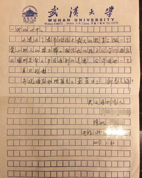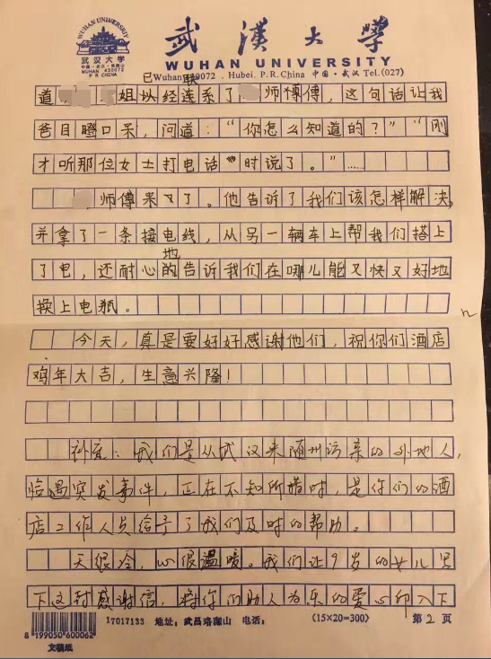 原来啊,这是一封感谢信,新年小姑娘一家来从武汉到随州走亲戚,在白云山国宾酒店入住,初三早上小姑娘一家准备开车前往博物馆,却发现车发动不起来了,酒店的工作人员在知道情况后,迅速联系师傅帮忙解决问题。小姑娘的爸爸在信的末尾写下了这样的话“天很冷,心很温暖”。