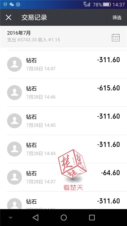 本月4号,他无意翻起妻子的手机,看到微信上有多笔交易记录,从5元多到600多元不等,大部分显示的都是各种充值和购买记录,总共消费了14539.5元。当杨吉质问妻子时,其妻也是一头雾水,不清楚发生了什么事。