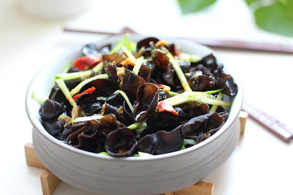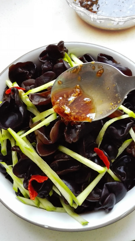 4、调匀的料汁浇在木耳上,用少许的黄瓜丝、干红椒装饰一下,拌匀即可