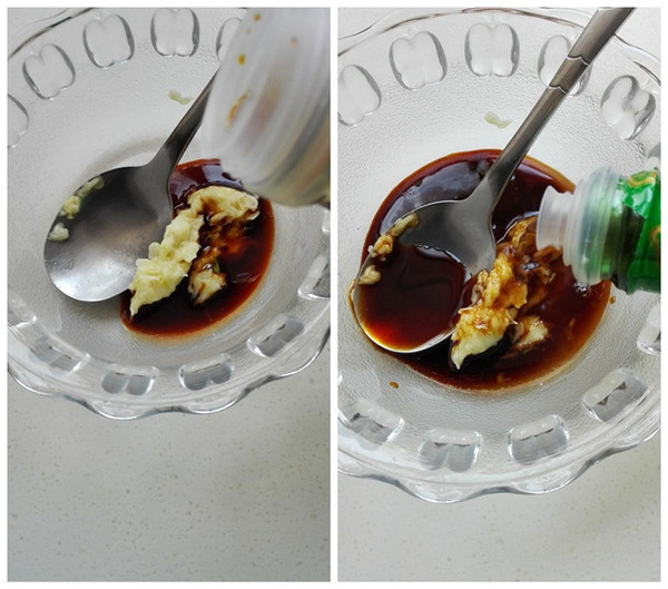 3、蒜捣成蒜泥,蒜泥中加生抽、米醋,入白糖、香油、鸡精,调匀