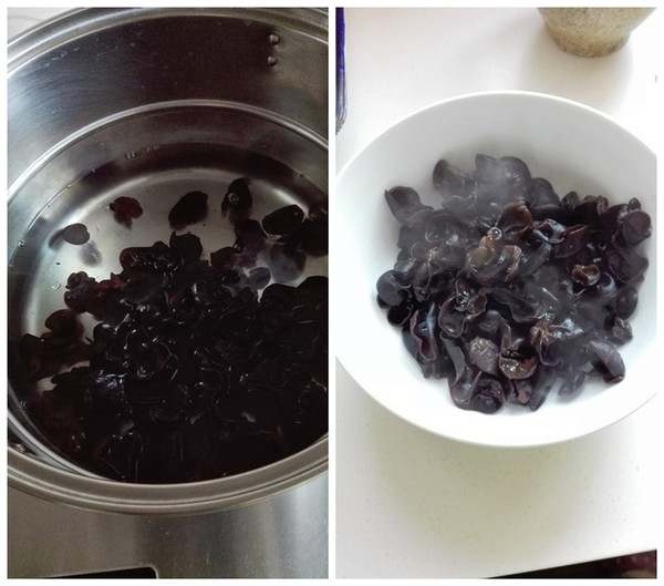 2、泡发后的木耳,入沸水锅中焯水,时间很短,不到一分钟,捞出木耳待用,这款口感更脆爽一些