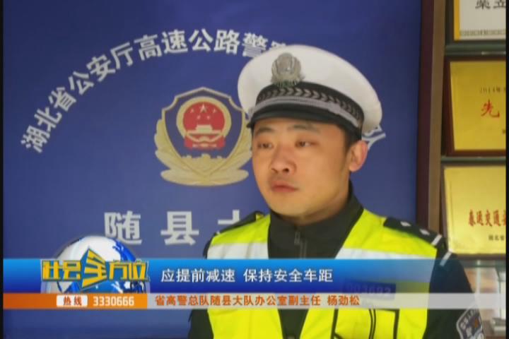 【采访】省高警总队随县大队办公室副主任 杨劲松:春节期间路面车辆较多,在变更车道时应观察后方近距离内有无车辆,在确保安全的同时开启转向灯后再变更车道,车辆在行驶过程中遇前方车辆打转向灯准备变道时,应提前减速,保持安全车距,切不可加速抢行,以免发生事故。