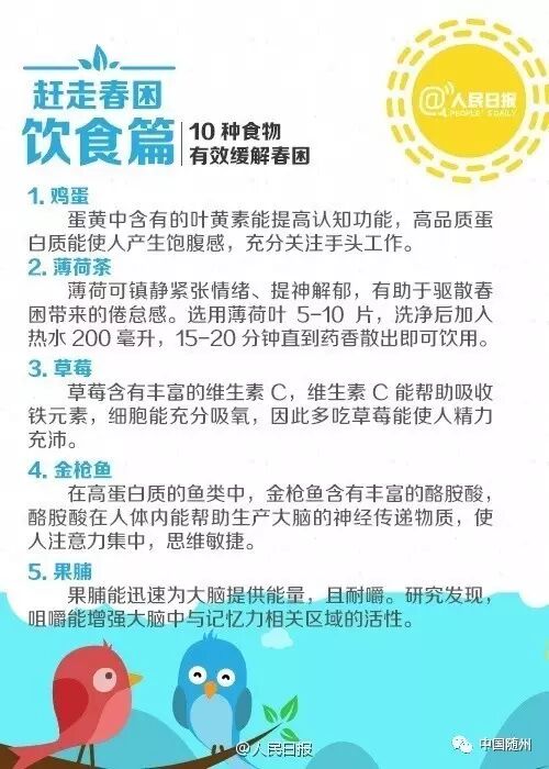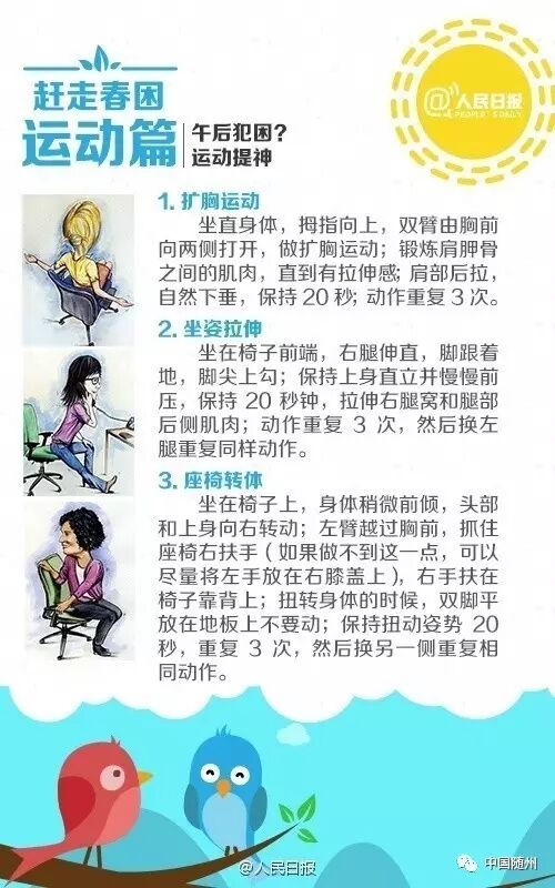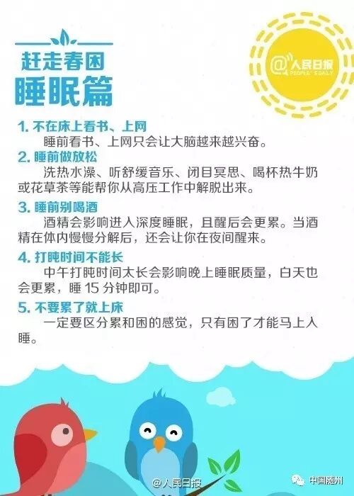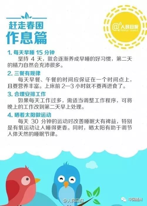 俗话说“春困秋乏夏打盹”,最近是不是早上睡不醒、工作没精神? 阳光晒在身上,你的浓浓倦意是不是也被勾起来了? 对付“春困”,给你支几招:①每天早睡15分钟;②中午打盹时间不要过长;③晨起午后适当活动。 赶走“春困”,找回好状态!