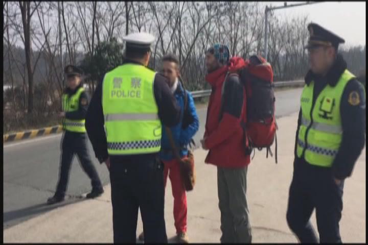 【采访】省高警随县大队秩序管理一中队副中队长 姚斌:在交谈的过程中,他说他是乌克兰人,从北京入的海关,然后一路就坐着顺风车,沿着高速公路从北往南走,他们的目的地是到长沙去玩,因为前面,一个搭顺风车的人临时有事,就把它们放在了高速公路上。