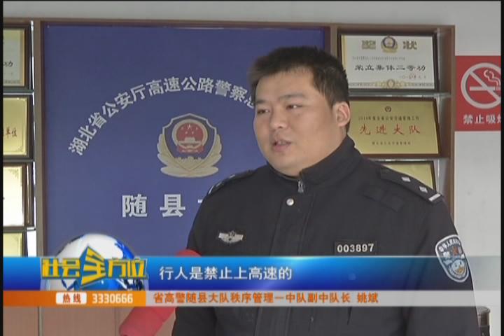 【采访】省高警随县大队秩序管理一中队副中队长 姚斌:根据《中华人民共和国道路交通安全法》规定,行人是禁止上高速的,在此提醒广大朋友,无论遇到什么事情,都不要在高速上行行走,更不要在高速上拦车,因为这会造成很严重的交通隐患,影响他人的正常行车安全。