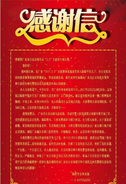 2月15日上午,交通事故受害人陈联平的亲属燃放着鞭炮,拿着一面绣有“破案神速显警威,真心为民扬正气”的锦旗和一封《感谢信》走进广水市公安局大院,感谢广水公安局领导和专案组全体民警历经艰难,不辞辛劳,快速侦破了广水“2017.2.2”交通肇事逃逸案,告慰了老人的在天之灵。