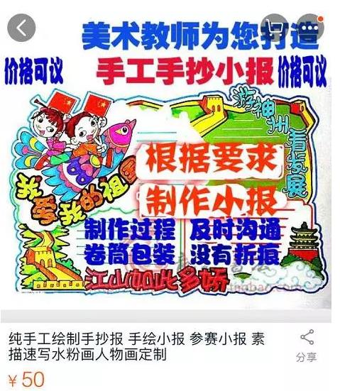 代做手工作业的网上店铺据淘宝上一些代做手抄报的店铺信息显示,手抄报代做要价根据尺寸不同略有差距。有卖家表示,可针对不同性别、不同年级提供定制化服务,“比如说,给女孩子画,我们会选取粉色系等一些活泼的色调。”