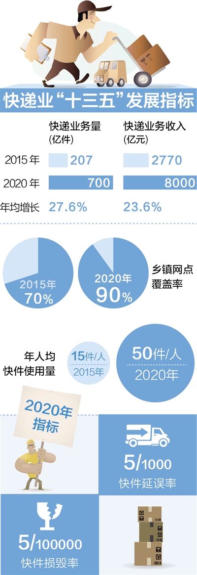 2020年,全国快递业务量达700亿件,快递业务收入8000亿元,乡镇网点覆盖率由2015年的70%上升到90%……日前,国家邮政局印发《快递业发展“十三五”规划》(以下简称《规划》),为2020年的中国快递业定了个“小目标”:基本建成普惠城乡、技术先进、服务优质、安全高效、绿色节能的快递服务体系,形成覆盖全国、联通国际的服务网络。“小目标”实现过程中,会遇上哪些大难题?该如何应对?记者就此采访了有关企业和专家。