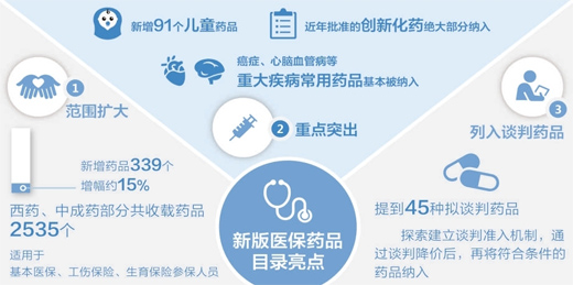 2017版医保药品目录,新增加药品339个,同时可适用于工伤保险和生育保险参保人员。调整目录中,给予儿童用药、创新药、癌症等重大疾病治疗药物更多的侧重。目录还提到45种拟谈判药品,通过谈判降价后,就会将符合条件的拟谈判药品正式列入。新版医保药品目录扩大了用药保障范围,有利于减轻参保人员药费负担,切实送上了更多民生红利。