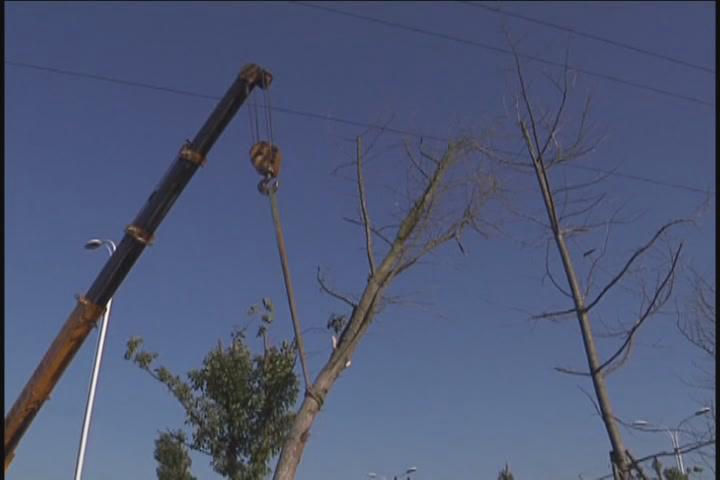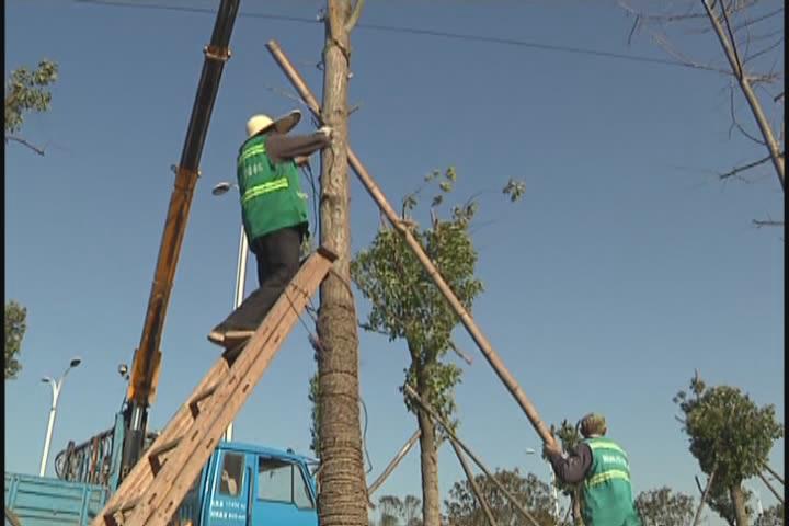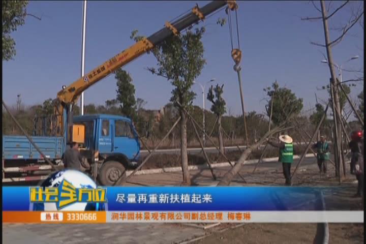 【采访】润华园林景观有限公司副总经理 梅春琳:今天我的辖区内吹倒了四棵树,尽量再重新扶植起来,我们机械人工都到位了,重新栽植,栽植以后加固,浇水。树倒了以后还能成活吗?现在正是栽树的季节,应该没有问题了。