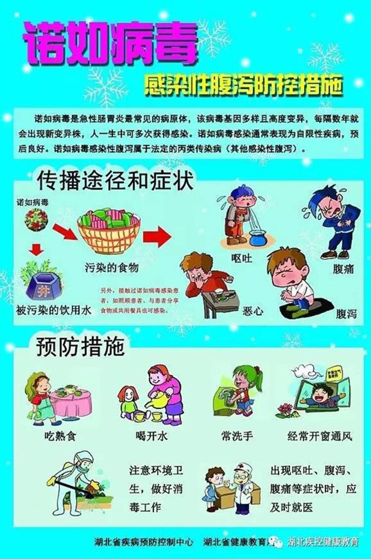 诺如病毒是一种粪-口途径传播的病毒,只要数十到一百个拷贝就能感染,容易在密集人群中如社区、学校、餐馆、医院、托儿所、敬老院、军队等处引起急性胃肠炎暴发。可通过污染的水源、食物、物品、空气等传播,通常细菌引起的食物中毒多发生在炎热的夏秋季节,而诺如病毒却偏爱寒冷季节,每年11月到次年4月是高发期。