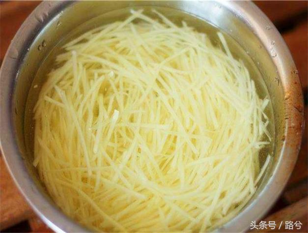 2 然后放在清水里泡10分钟,中间换一次水,把土豆里的淀粉过滤掉,土豆丝吃起来才脆。
