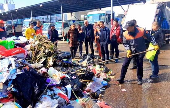 近8吨的垃圾在空地上 “卸货”后好似一座小山,4名环卫当场把垃圾全部铺开,只能靠着每人手里的棍子不断翻找,边上美容院的员工一边辨认店里的垃圾袋。