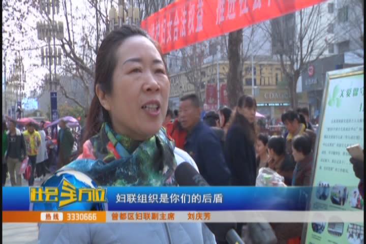 为迎接“三八”国际妇女节的到来,3月8号,市妇联、曾都区妇联在城区解放路开展“维护妇女合法权益,促进社会和谐发展”为主题的妇女维权宣传活动,活动现场,市、区两级妇联组织巾帼自愿者通过悬挂横幅、摆放展板、发放资料、法律咨询等形式,围绕《妇女权益保障法》、《婚姻法》、《反家庭暴力法》等内容,广泛宣传有关妇女儿童的法律法规,引导广大妇女遵法、学法、守法、用法,切实增强依法维护自身权益的意识和能力,除此之外,市妇联还邀请了曾都区乡音艺术团通过传统的文艺表演形式向市民普及婚姻家庭纠纷调解委员会的工作。