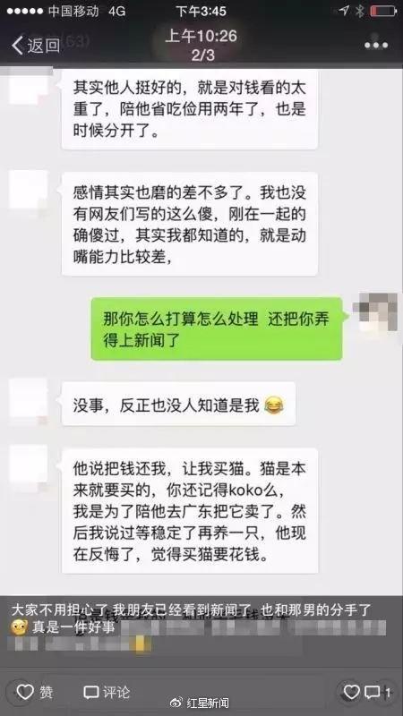 3月8日,网曝一女子月收入8000元每月只有600元的生活费,想购买一只2500元宠物猫还得男朋友批准,其原因是每个月工资都上交给男朋友,男友说存钱买房,每月只给她600元生活费,目前女生有18万存款都在男友那里,也不敢提分手,一方面两人还有感情,一方面担心,一旦分手,钱还要得回来么?
