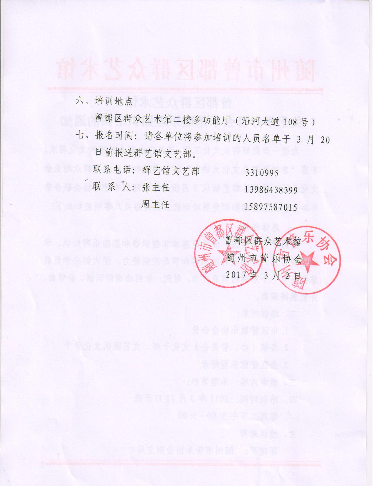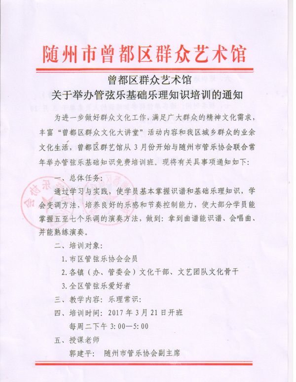 曾都区群艺馆从3月份开始与随州市管乐协会联合常年举办管弦乐基础知识免费培训班。培训时间:
